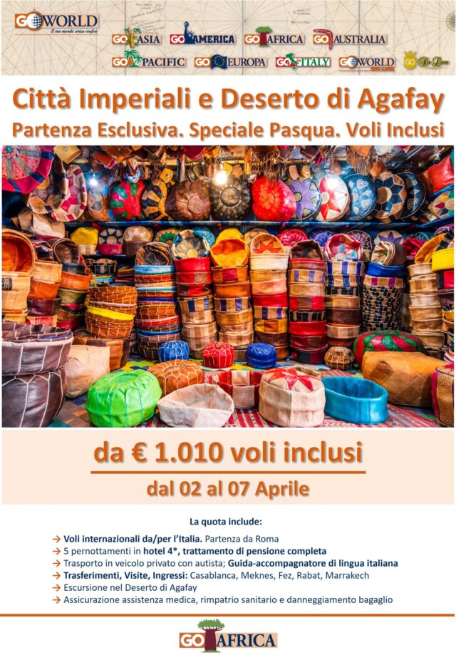 Il Marocco è una terra che incanta con i suoi colori, i profumi delle medine e l’eleganza delle sue Città Imperiali. Questo viaggio speciale di Pasqua conduce alla scoperta dell’anima più autentica del Paese, tra palazzi reali, souk animati, architetture storiche e l’esperienza suggestiva del Deserto di Agafay.