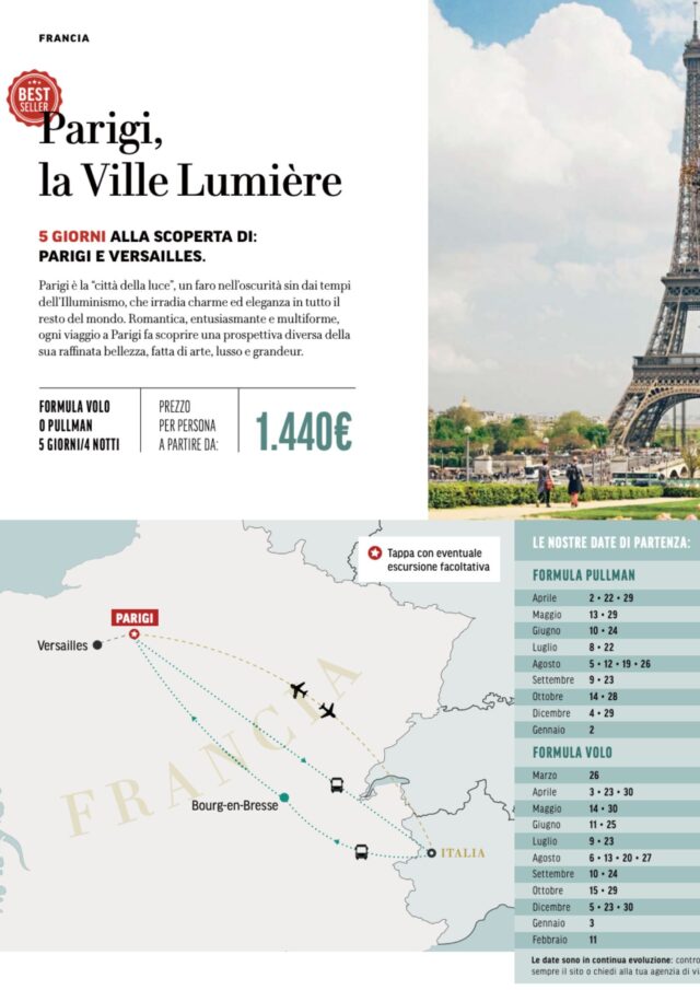 Il tour prevede 5 giorni/4 notti ed è disponibile in diverse date durante l’anno, con partenze anche nella settimana di Pasqua, un periodo ideale per visitare Parigi grazie al clima mite e all’atmosfera primaverile della città.